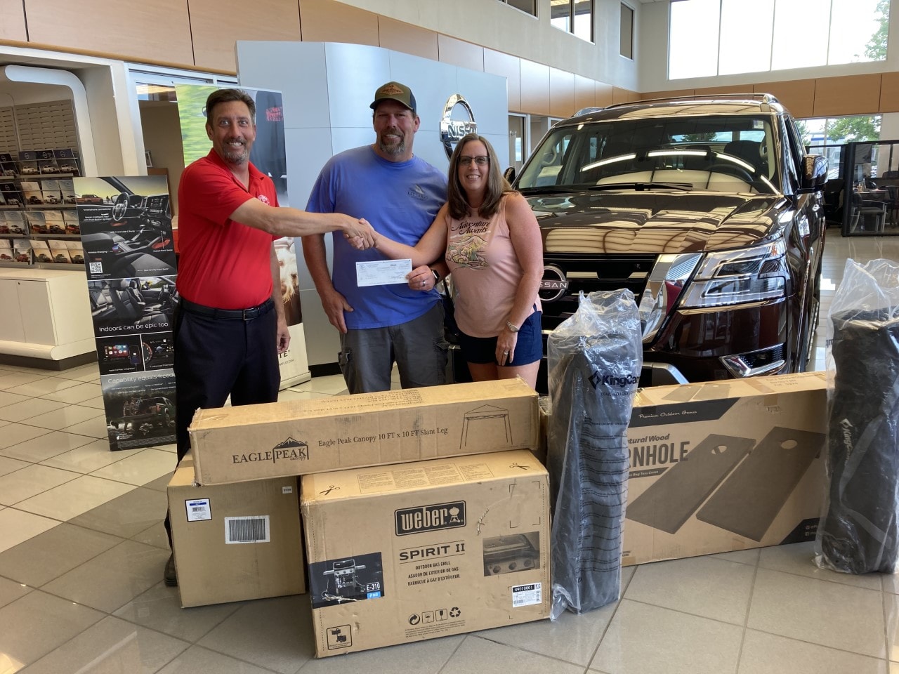 Must be 18 years or older and a legal resident in the state of Missouri to win. One entry per person, per household. Entries must be received during the Giveaway Period to be eligible. One winner of prize package chosen at random and announced on May 27, 2022. Must pick up prizes in person. St. Charles Nissan employees are not eligible. Purchase of vehicle does not increase chance of winning. Giveaway is subject to all applicable federal, state, and local laws and regulations. Void where prohibited. St. Charles Automotive is not responsible for lost, late, damaged, misdirected, delayed, illegible, undelivered, inaccurate or incomplete entries or prize claims. By participating in this giveaway, participants agree that released parties will have no liability or responsibility whatsoever for, and shall be held harmless by participants against, any liability for any injuries, losses or damages of any kind (including without limitation, direct, indirect, incidental, consequential, or punitive damages) to persons, including personal injury or death, or property resulting in whole or in part, directly or indirectly, from acceptance, possession, misuse, or use of the prize, entry, or participation in this giveaway or in any giveaway related activity, or any claims based on publicity rights, defamation or invasion of privacy, or merchandise delivery. The released parties are not responsible if any prize cannot be awarded due to travel cancellations, delays, or interruptions due to acts of god, acts of war, natural disasters, or weather. Released Parties are not responsible for any human, technical, typographical, printing or other error which may occur in connection with the Giveaway, including errors in Giveaway-related materials, in the printing or advertising of these Official Rules, the administration of the Giveaway, or in the announcement of winners. Prizes include: EAGLE PEAK 10' x 10' Slant Leg Pop-up Canopy Tent, KingCamp 2 Pack Heavy Duty Oversized Folding Camping Chairs, YETI Roadie 24 Cooler, GoSports Solid Wood Premium Cornhole Set, Weber Spirit II E-310 3-Burner Natural Gas Grill, and $1,000 cash. Total value of prizes $2,236.60. No purchase necessary. See dealer for details.