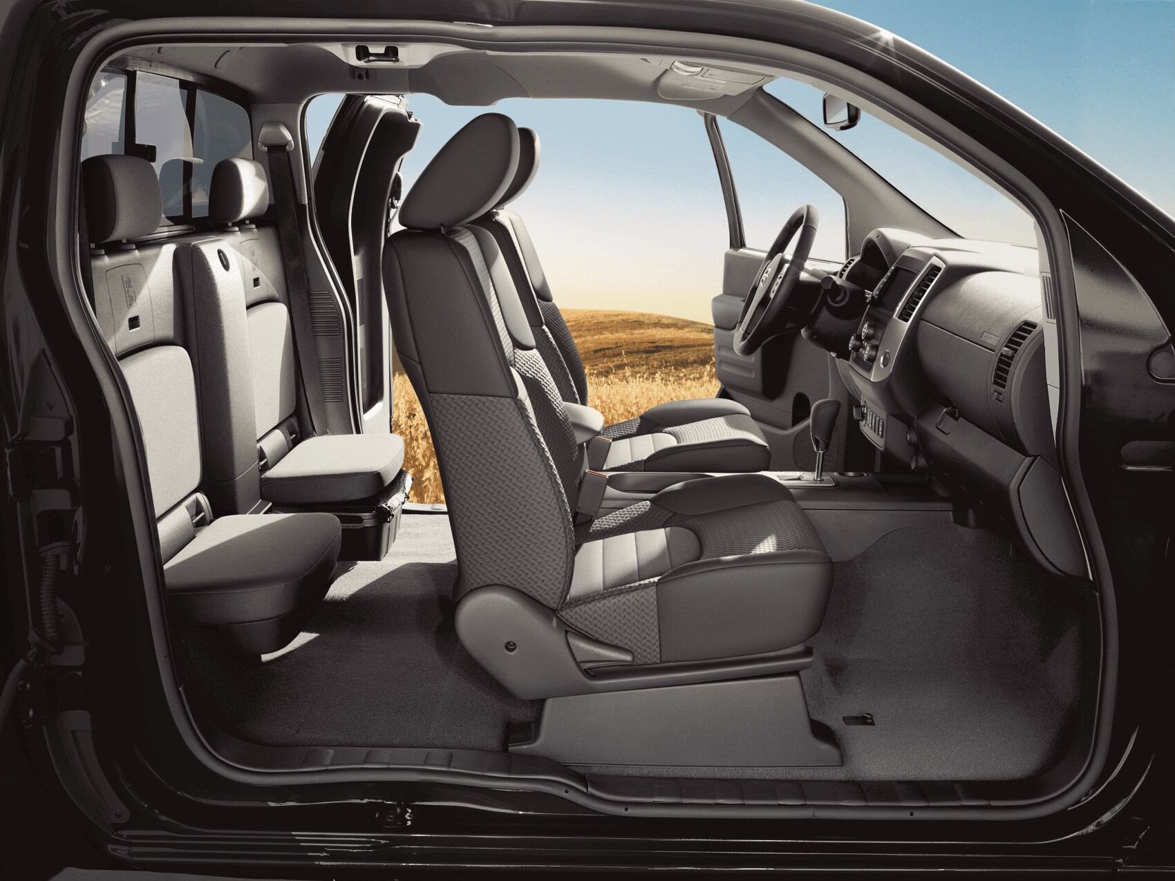 There are boundless interior comforts in the Nissan Frontier. It begins right where you sit if you get the King Cab. With the King Cab seating, you'll be able to use rear-swinging pillarless rear doors that provide a huge opening for extra-large items. Its two rear seats face forward or flip up and out of the way, providing a wide-open space for cargo.