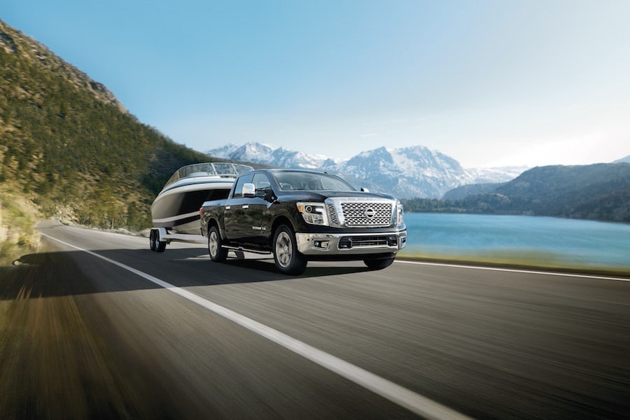 The TITAN offers a turbocharged 5.0L diesel-powered V8 engine that produces 310 horsepower and 555 lb-ft of torque mated to a 7-speed automatic transmission. Properly equipped, the TITAN's maximum towing capacity is 9,740 pounds, and the payload maximum is 1,950 pounds. The TITAN XD can tow up to 12,760 pounds and carry a payload of 2,910 pounds.