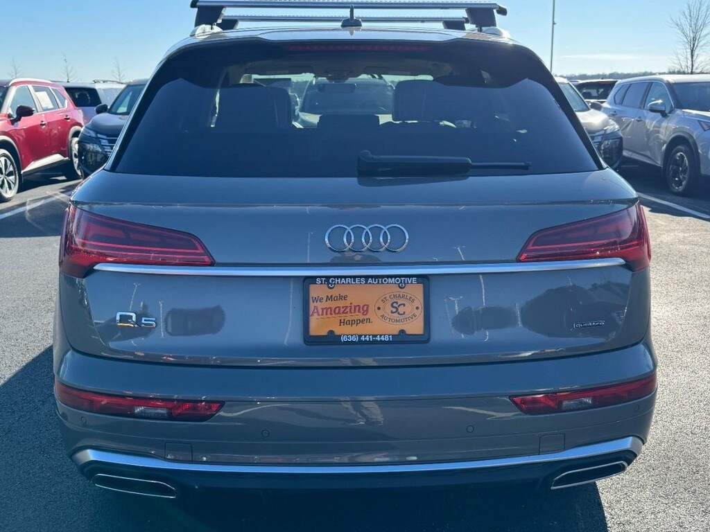 At St. Charles Nissan, the #1 volume Nissan dealership in Missouri for 2024, youâll find the largest selection of new and used cars for sale near youâ"with best prices, fast financing, and top trade-in values. This Q5 45 S line Premium is nicely equipped with Atlas Beige w/Leather Seating Surfaces, 10 Speakers, 4-Wheel Disc Brakes, ABS brakes, Air Conditioning, Alloy wheels, AM/FM radio, Auto High-beam Headlights, Auto-dimming Rear-View mirror, Automatic temperature control, Brake assist, Bumpers: body-color, Compass, Delay-off headlights, Driver door bin, Driver vanity mirror, Dual front impact airbags, Dual front side impact airbags, Electronic Stability Control, Emergency communication system: Audi connect CARE, Exterior Parking Camera Rear, Four wheel independent suspension, Front anti-roll bar, Front Bucket Seats, Front Center Armrest, Front dual zone A/C, Front fog lights, Front reading lights, Garage door transmitter: HomeLink, Genuine wood console insert, Genuine wood dashboard insert, Genuine wood door panel insert, Heated 8-Way Power Front Bucket Seats, Heated door mirrors, Heated front seats, Heated steering wheel, Illuminated entry, Leather Seating Surfaces, Leather Shift Knob, Leather steering wheel, Low tire pressure warning, Occupant sensing airbag, Outside temperature display, Overhead airbag, Overhead console, Panic alarm, Passenger door bin, Passenger vanity mirror, Power door mirrors, Power driver seat, Power Liftgate, Power passenger seat, Power steering, Power windows, Radio data system, Radio: Audi Sound System, Rain sensing wipers, Rear air conditioning, Rear anti-roll bar, Rear fog lights, Rear reading lights, Rear seat center armrest, Rear window defroster, Rear window wiper, Remote keyless entry, Roof rack, Security system, Speed control, Speed-sensing steering, Speed-Sensitive Wipers, Split folding rear seat, Spoiler, Steering wheel mounted audio controls, Tachometer, Telescoping steering wheel, Tilt steering wheel, Traction control, Trip computer, Turn signal indicator mirrors, Variably intermittent wipers, and Wheels: 18" 5-Arm-Turbine Design.