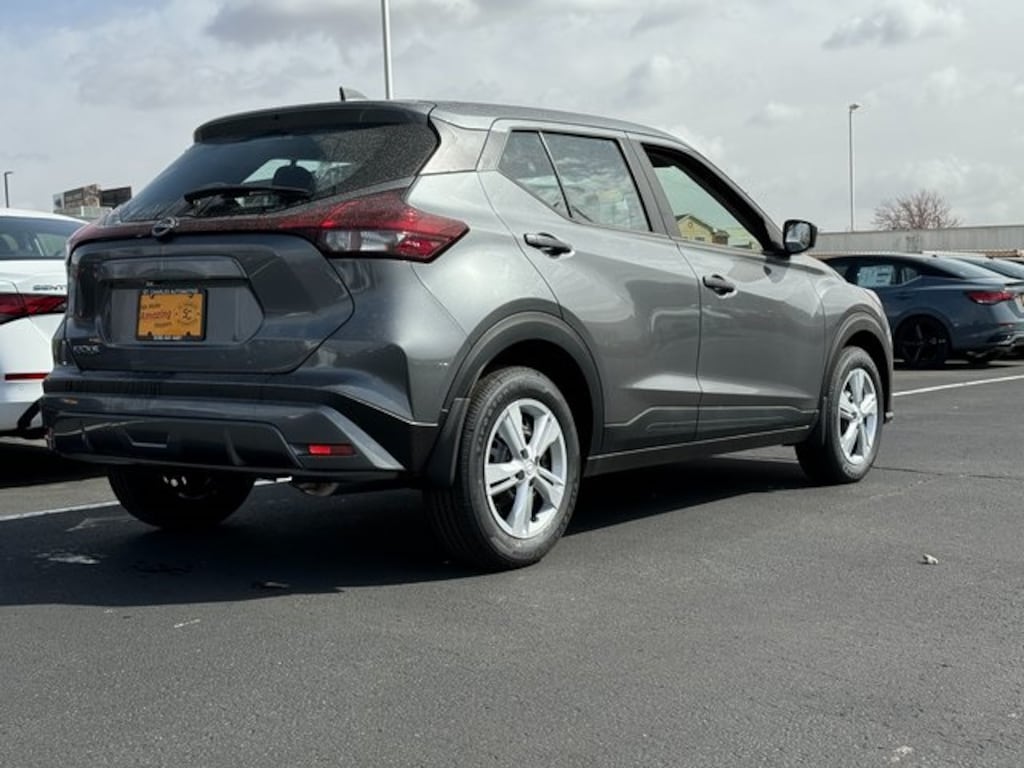 Certified. Gun Metallic 2025 Nissan Kicks Play 4D Sport Utility S 1.6L 4-Cylinder DOHC 16V FWD CVT Clean CARFAX.